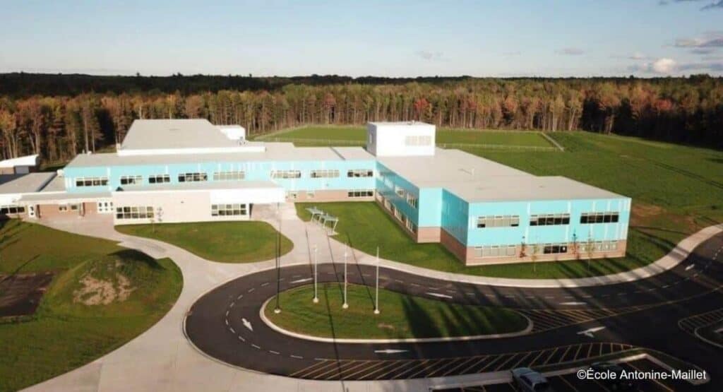 École Antonine‑Maillet (grades 6–8) in Dieppe is a modern LEED-certified middle school that opened in September 2018, serving over 500 students with bright classrooms, dual gyms, music and science labs, a stage, library, soccer field and cafeteria.